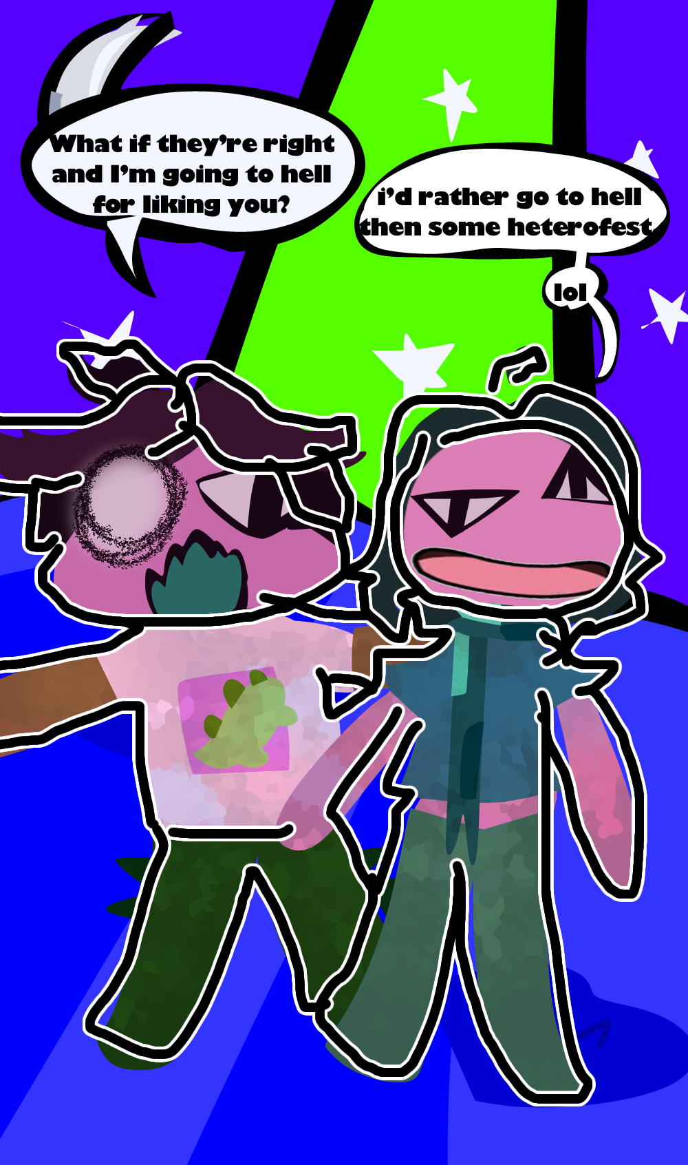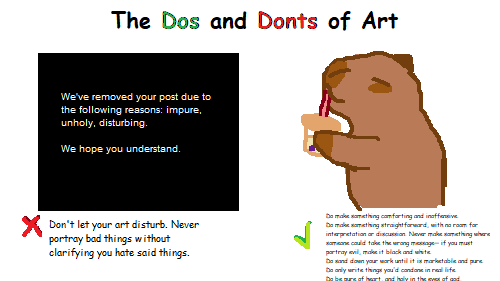 I remember one time I was on pinterest, and there was this one post like share a tag you like in fics. I'm half sure it specified controversial or something, but it's been a while. Someone said emotional manipulation, which in all honesty is pretty tame. The reply they got was "that's not cute". I think about that response, it wasn't too surprising, I've never known pinterest to have the most radical takes, but it was odd. Does art have to be cute? Is that really how some people view it? Art is only meant to be there and be perfectly digestable and unchallenging?